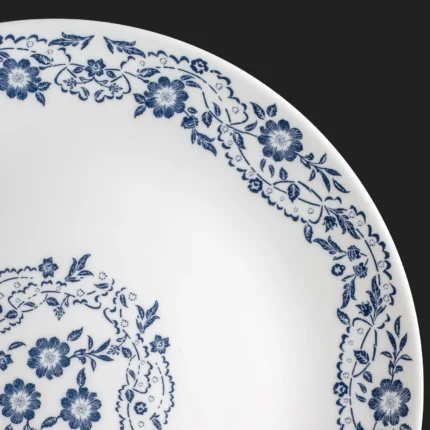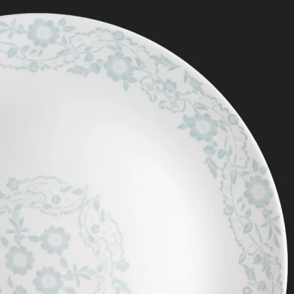 طرح وایولت با الهام از گلهای ریز و شاخههای ظریف، یک قاب کلاسیک و تمیز دور ظرف ایجاد میکند؛ حاشیهی گلدار باعث میشود لبهی بشقابها جلوهی بیشتری پیدا کند و چیدمان میز «مرتب و لوکس» دیده شود، بدون اینکه طرح شلوغ یا سنگین باشد. در مرکز ظروف هم یک مدالیون گلدار ملایم قرار گرفته که هماهنگی بصری سرویس را کامل میکند و هنگام سرو غذا، حس یک ست یکدست و هماهنگ را به میز میدهد. تفاوت رنگها هم کاملاً روی شخصیت طرح اثر میگذارد: آبی سورمهای طرح را پررنگتر و رسمیتر نشان میدهد و برای مهمانیها بسیار چشمگیر است، در حالی که فیروزهای همان نقش را لطیفتر و روشنتر نمایش میدهد و برای چیدمانهای مینیمال و روزمره فوقالعاده دلنشین است.
